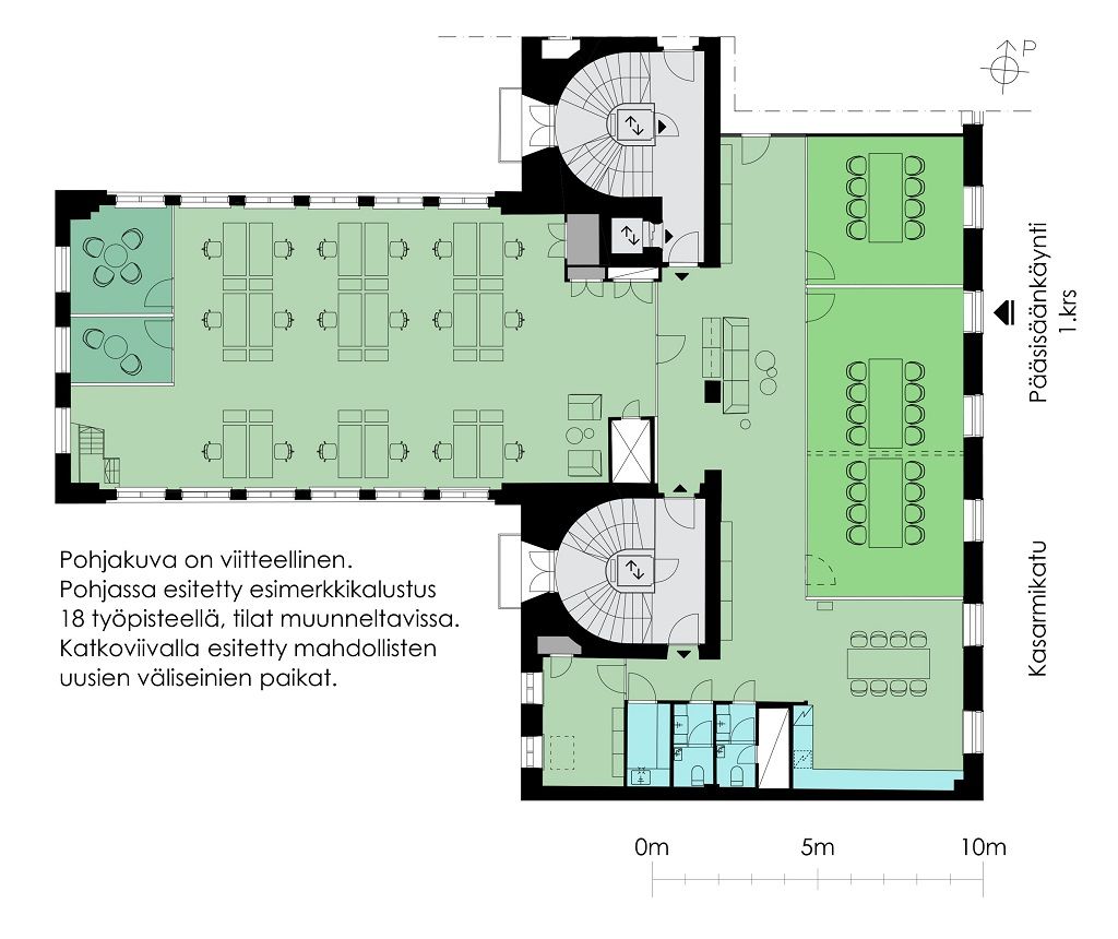 Kiinteistö sopii erinomaisesti keskeistä ja rauhallista sijaintia arvostavalle yritykselle. Sijainti edessä avautuvan Kasarmitorin äärellä tarjoaa arvokkaan ja seesteisen ympäristön vain kivenheiton päässä keskustan sykkeestä.