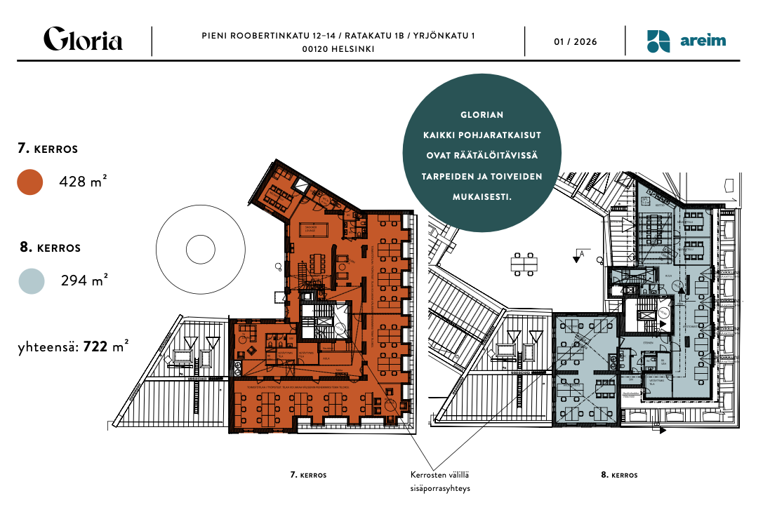 Vuokrataan uniikki tila Kaartinkaupungista. Upea sisäportaalla yhdistetty kaksikerroksinen tila herää uuteen aikaan. Glorian matka kohti uutta tulevaisuutta on alkanut. Glorian torni tarjoaa mahdollisuuden luksustason toimistototeutukselle. Hulppea huonekorkeus ja kaari-ikkunat tuovat elämyksellisyyttä työskentelyyn.