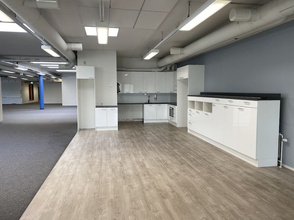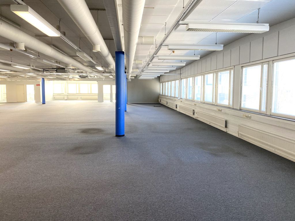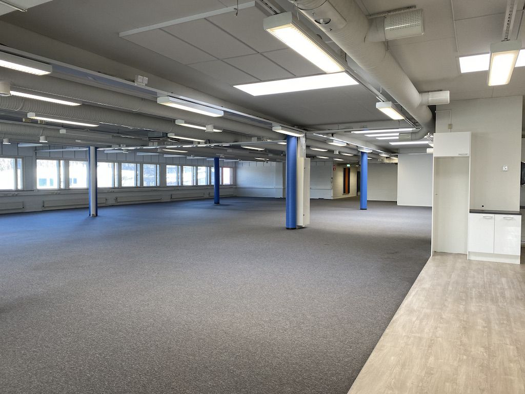 Varastotilasta porrasyhteys 2. kerroksen 737m2 toimistoon. Toimistotilassa on avotilaa, keittiö ja muutama huone.
