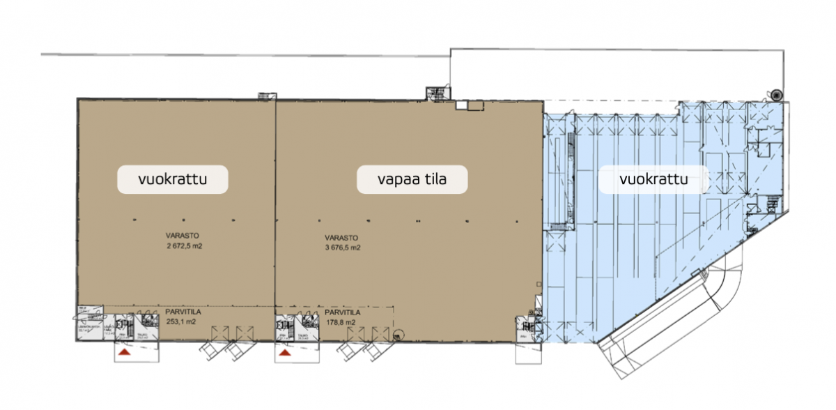 Varaston 3745m2 vapaa korkeus 9,7 metriä ja tilassa on 2 lastaustaskua ja tilaan mahdollista tehdä vielä yksi lisää. Tilaan kuuluu lisäksi noin 224 m2 toimistotila 2. kerroksessa. Tilat toteutetaan valmiiksi seuraavalle käyttäjälle.