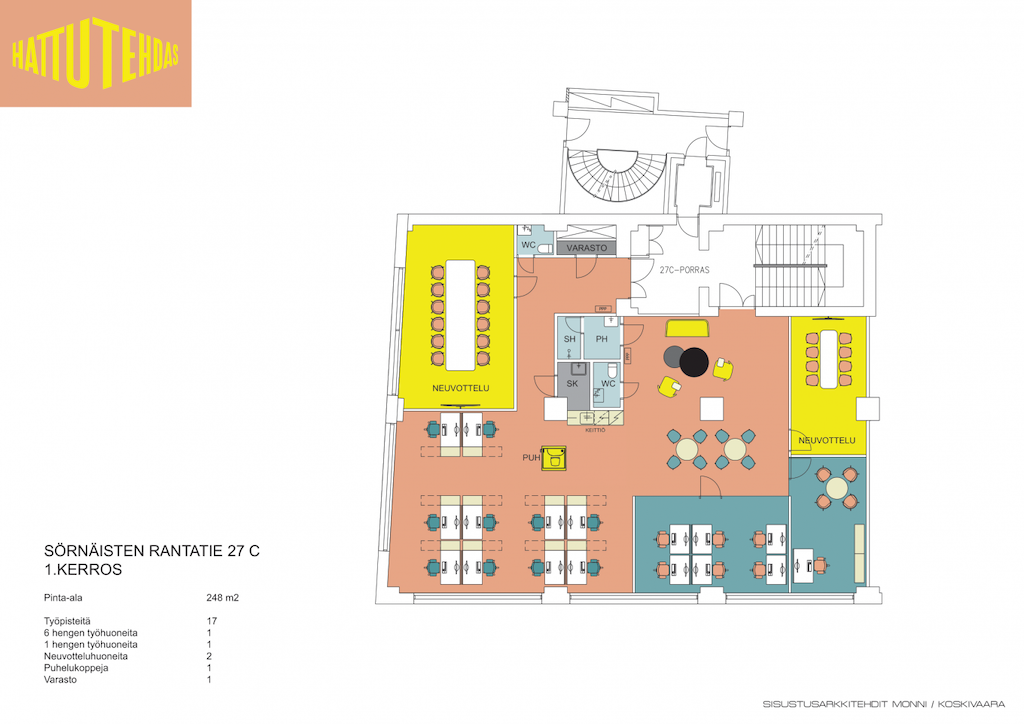 Vuokrataan viihtyisä ja persoonallinen toimistotila Sörnäisten Hattutehtaalta. Tila sijaitsee 1. kerroksessa, mutta ei kuitenkaan katutasossa. Tilassa on avotyötilaa, neuvotteluhuoneita sekä tilava keittiö/taukotila. Ikkunoista on urbaani näkymä Suvilahden suuntaan.