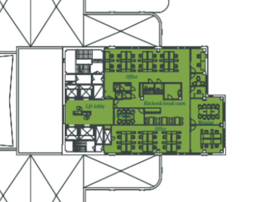 Tässä kohteessa on runsaasti vuokralaisten yhteiskäytössä olevia tiloja, kuten suuri neuvottelutila kokonaisuus ja work-lounge alueita, sekä auditorio, kuntosali, liikuntatilat ja sosiaali- ja saunatilat.