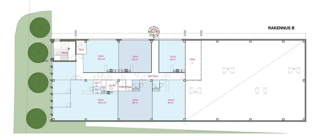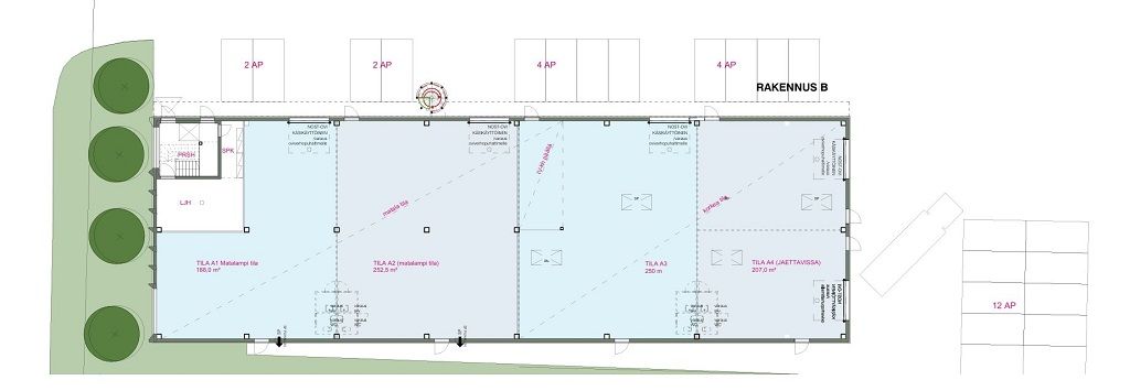 Kohteeseen on suunniteltu 4 hallilohkoa, joiden koko on 188 m2 - 257 m2 välillä. Toimistotilaa rakennetaan yläkertaan kokoluokissa 40 - 134 m2. Mahdollisuus yhdistää kaikki tilat ja vuokrata koko rakennus.